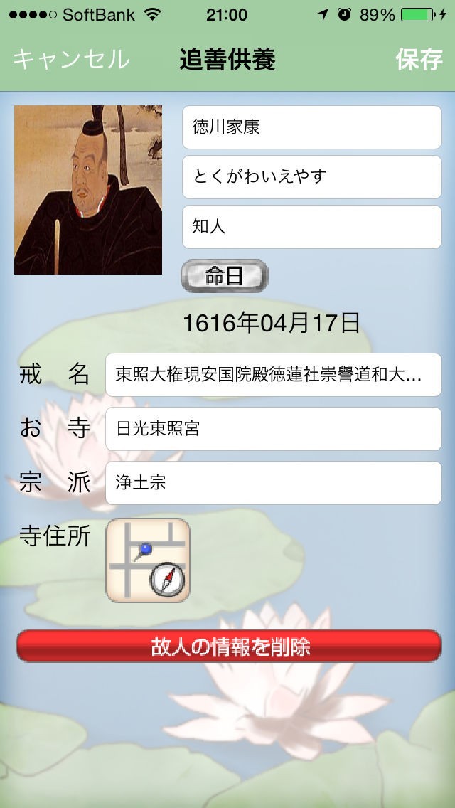 故人の情報ページには、名前と命日だけでなく、お写真、続柄、戒名、お寺、宗派、お墓の所在地まで登録管理できます。お墓の場所はGoogleMap上にGPSで位置登録ができます。