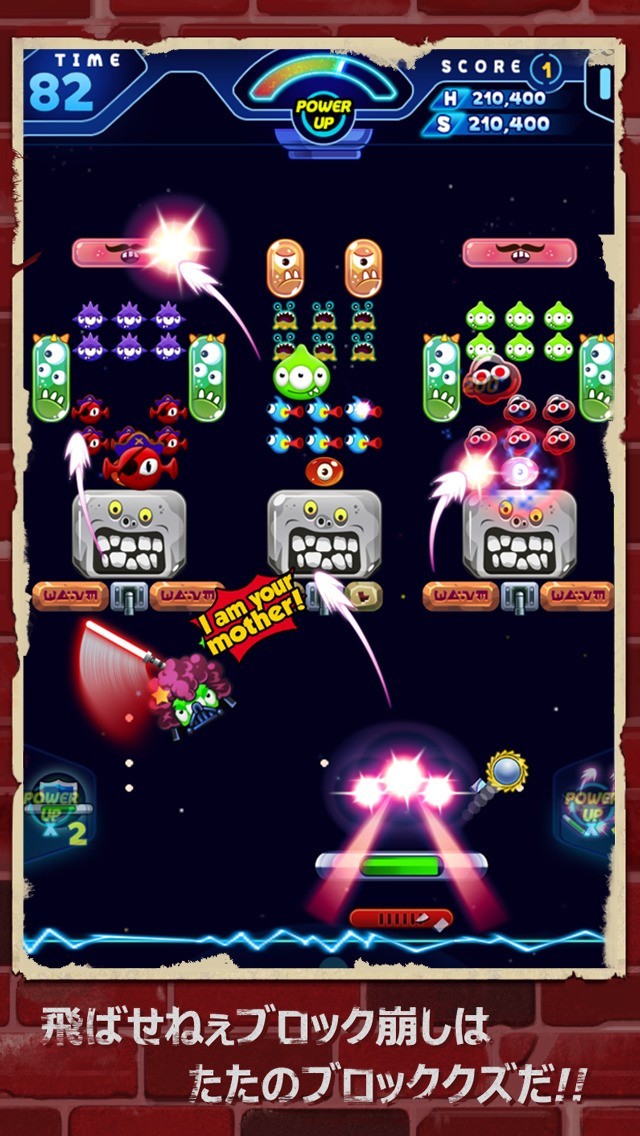 普通のブロック崩しにはないPOPな雰囲気で新鮮にプレイできます。有名な映画のパロディーのステージやスペシャルアイテム、誘導ミサイルなどのスキル、一風変わったブロック崩しで楽しめます!