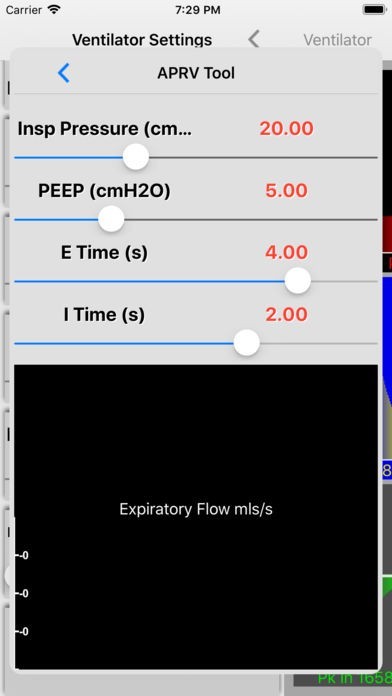 Select your ventilator rate (bpm) and I:E ratio using the sliders. You have a choice of three ventilator modes; Pressure Control, Volume Control and Flow Control. You are able to adjust appropriate input values for each of these (Inspiratory pressure, tidal volume or inspiratory flow) as well as apply PEEP and in volume control mode add an end inspiratory pause.