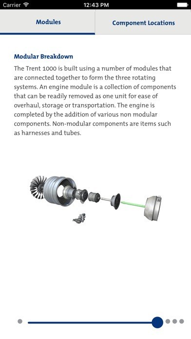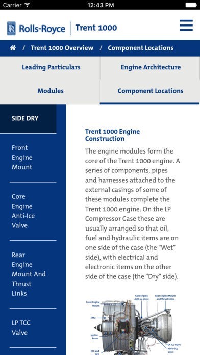 The app provides an opportunity to learn about the key modules and components of the Trent 1000 through the interactive ‘Engine Overview’ feature and understand how they work together to deliver a range of ‘Engine Systems’.