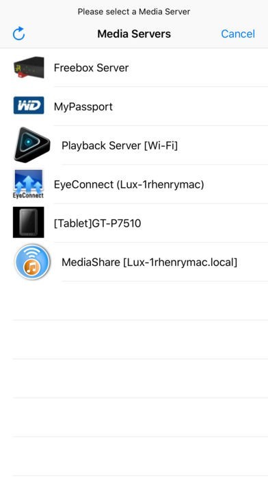 - At app launch, i.e. if the app is not resuming from the background, you should be automatically prompted with a list of media servers discovered on the network. If no server is found, use the refresh arrow in the top navigation bar to force a rediscovery.