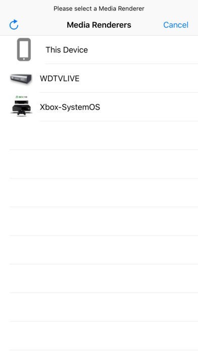 - You should be prompted with a list of media renderers discovered on the network. Note that your device is always present by default. If no remote renderer is found, use the refresh arrow in the top navigation bar to force a rediscovery.
