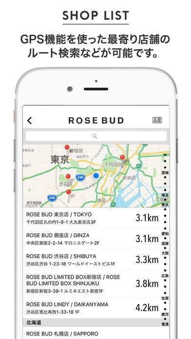 アプリでは全国のROSE BUDの店舗を検索することができます。土地勘がない場所でもGPS機能を利用して最寄りの店舗までルートを検索できる機能もあるので、どこへ行ってもお店を探すことができ便利です。