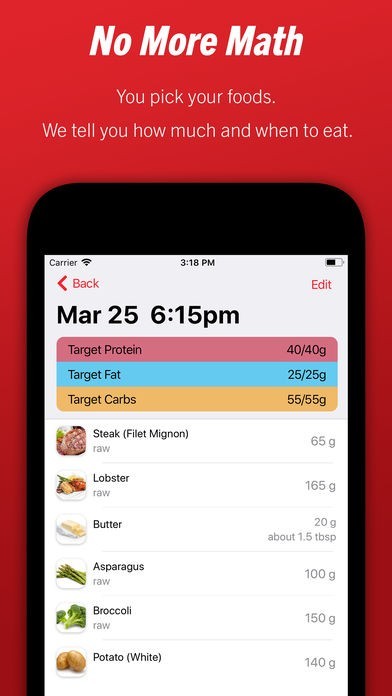 Based on the goal you choose, the app designs a custom diet that fits your schedule, but it doesn't choose your foods.