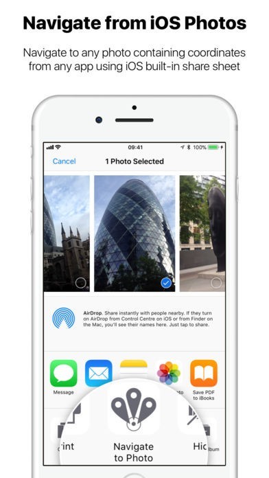 Just pick up to 5 photos within the Photos app, tap share and choose 'Navigate to Photo'.
