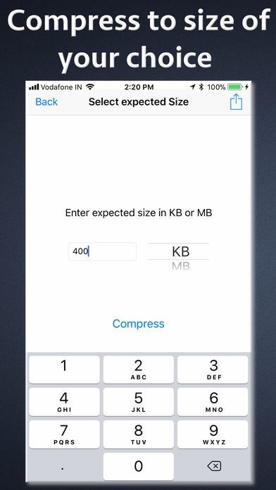 -- The application supports defining an exact size to be achieved using compression.Using this feature, one could specify that what is the exact size he is expecting from the photos after compression.
