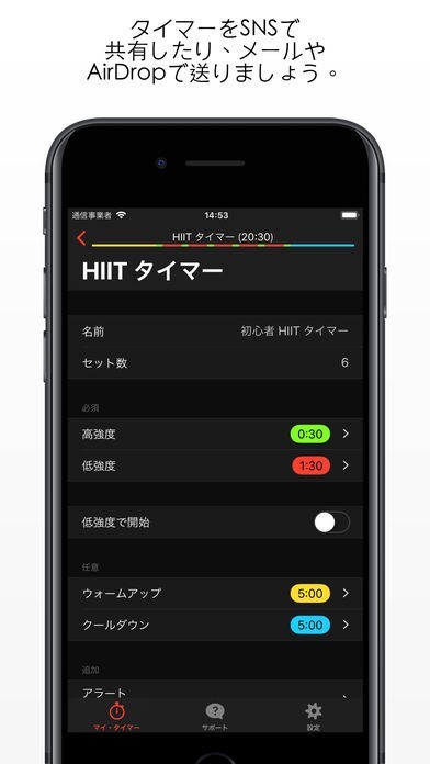 自分が設定したインターバルタイムとトレーニングタイムをFacebookやTwitterでシェアすることが出来るので、仲間同士で簡単に共有することが可能となっています。