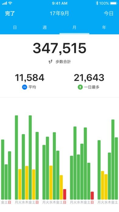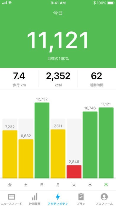 毎日の歩数目標を設定することができるようになっていて、達成状況を確認することが可能となっているほか、連続目標達成日数をカウントしてくれるので毎日のウォーキングへの意欲が高まります。