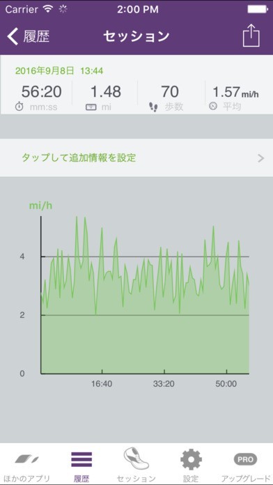 上から歩数、時間、速度、距離を表示してくれて、それらは緑のグラフで示してくれる