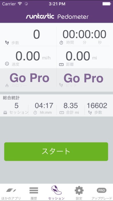 「Runtastic Pedometer 」では、ウォーキングの情報を毎日収集していくことで、より効率よく健康的になったり、カロリーを消費したりということを出来るようにしてくれます。 よって、ダイエットをしようとしている方にとって役に立ちます。 上から歩数、時間、速度、距離を表示してくれて、それらは緑のグラフで示してくれます。 「セッション」では、具体的な目標を設定してそれを達成をする手助けをしてくれるので、それをきっかけにして運動を続けることも出来るでしょう。