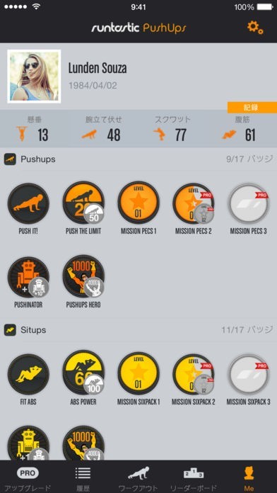 トレーニングで腕立て伏せをするときに使用してください。腕立てをした回数によって、バッジを手に入れることができます。集めたバッジは一覧で見ることができ、トレーニングのモチベーション維持に役立ちます。
