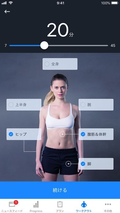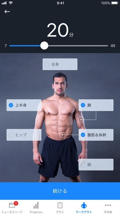 「カスタムワークアウト」なら鍛えたい箇所とトレーニング時間を選ぶだけで、専用の筋トレメニューを作れます。鍛えたい箇所は全身、上半身、腕、腹筋&体幹、ヒップ、脚の6つから選択でき、トレーニング時間は7~45分の間から選択できます。