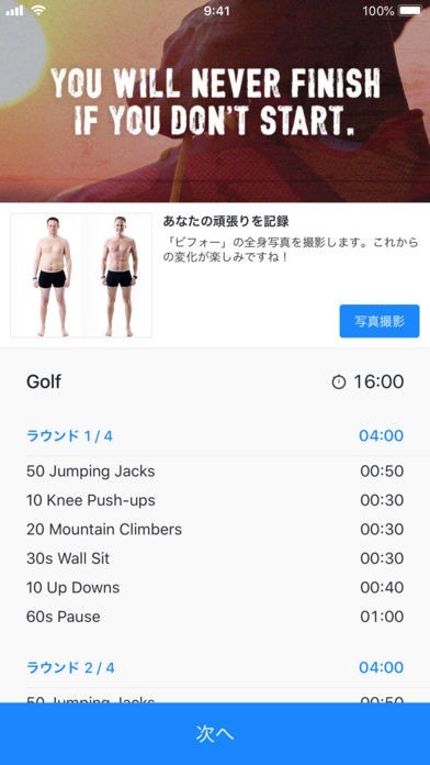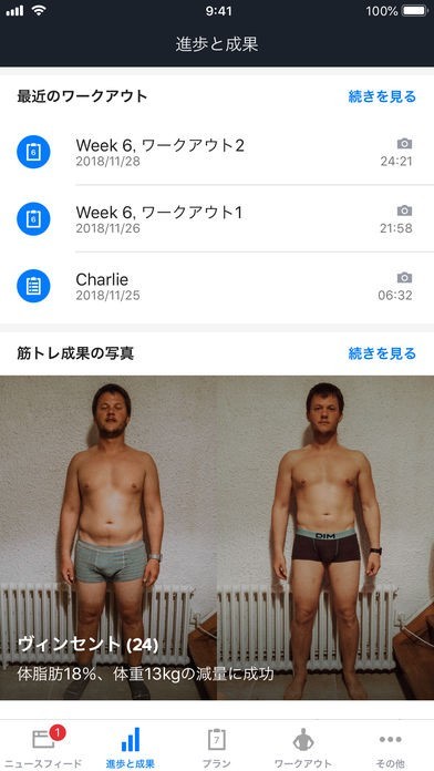 撮影した写真をビフォーアフター的に並べる機能があり、自分の身体がどのように変化したか確認できます。またワークアウトの音楽をiTunesなどで手に入れられます。お気に入りの音楽でトレーニングを楽しみましょう。
