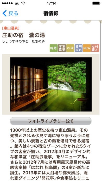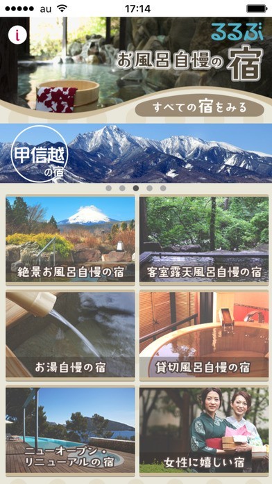App Storeより引用お風呂自慢の宿が大集合!東北、関東、中部エリアを中心に、絶景自慢の宿や、客室露天・貸切風呂を持つ宿、泉質に自信アリの宿など約110件を厳選してご紹介。それぞれの宿に最大31点ものフォトライブラリーを備え、宿選びのお手伝いをします。るるぶ.comや宿のWebサイトからすぐに予約ができる機能付き(※一部予約機能のないサイトあり)。温泉旅行をお考えの際にはぜひご利用下さい。