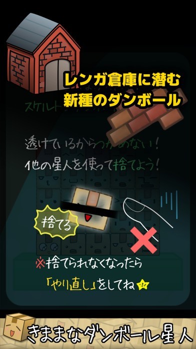 ダンボール星人を指で取り出して画面外へ放り投げよう。もちろん他の箱は大事だからつかめないよ。