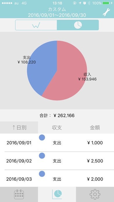 支出と収入に関する数値をカレンダーに細かく登録出来るようになっています。さらに自動で円グラフを表示してくれるため、お金を使い過ぎた日も分かりやすくチェック出来ますよ。