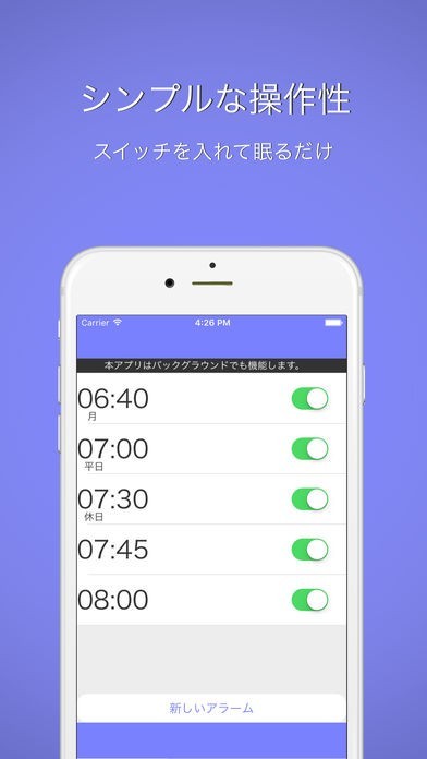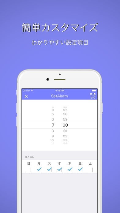 *アラームセット後、他アプリで音楽を再生するとアラームが鳴らなくなる可能性があります。