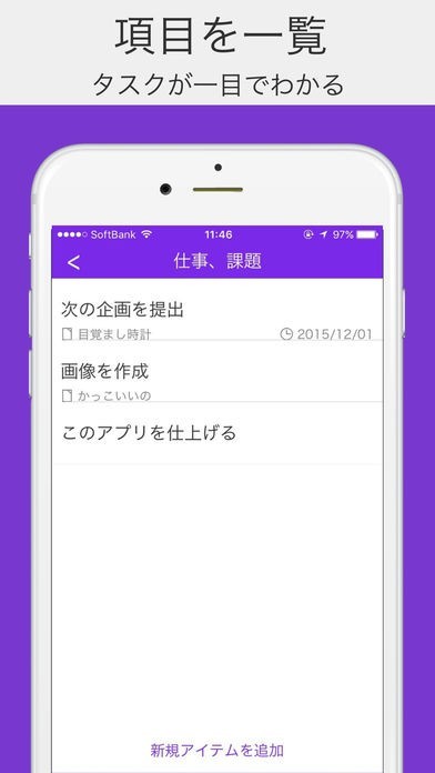 やるべきことをリスト化して登録したとしても、その量が膨大であればいくつかは忘れてしまうかもしれません。そこでこのアプリでは通知機能を付属し、設定した日に近づけば警告してくれるようになります。