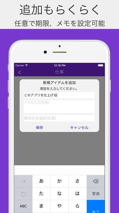 このアプリでは行うべき作業を記録させることが可能です。 行うべき作業がたくさんある場合、一つ二つ忘れてしまうことがありました。 そんな時でもこのアプリに記録させておけば、忘れないようになります。 項目に設定した期限が近くなるとお知らせする機能が付いています。 期限ギリギリの時に忘れていることに気が付き、後で慌てるということも防止できます。 仕事は勿論のこと、買い物や趣味など日常生活でも便利に使えるアプリです。 シンプルなアプリのために初めての方でも感覚的に操作することが可能です。