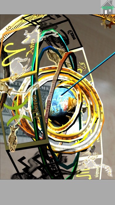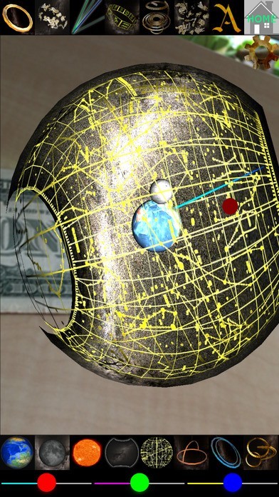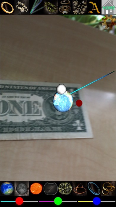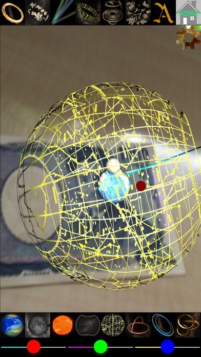 マーカー(千円札、一ドル札、顔、解説サイトの画像のいずれか)を写すと月と地球と太陽と星座と天球儀が表示され滑らかに回転してすべてが現実に重なります。