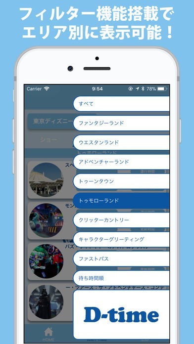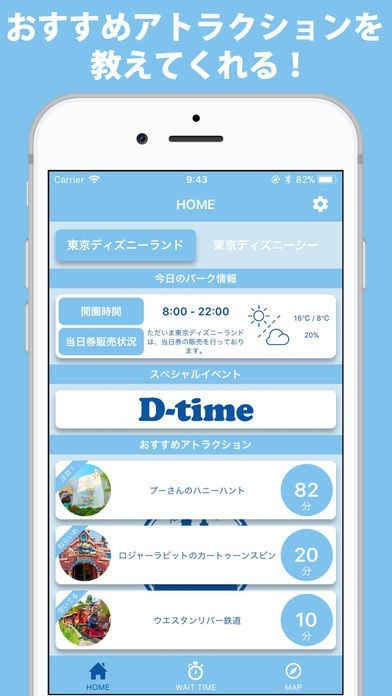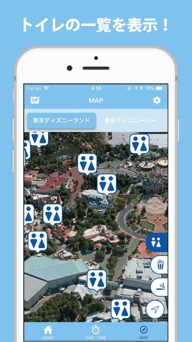 D-time - TDRの待ち時間はおしゃれなデザインになっており東京ディズニーランドの待ち時間を調べるアプリとは思えないくらいスタイリッシュでかっこいいアプリです。トイレの場所もどこにあるか分かりやすく表示してくれるので迷わずに済みます。