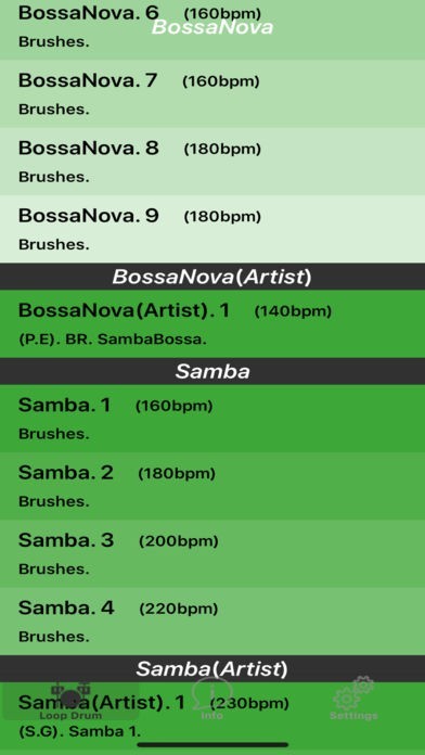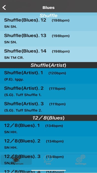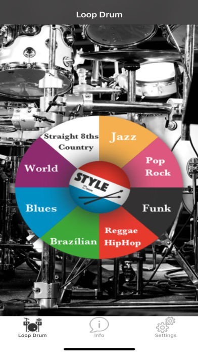 起動するとまず、リズム選択画面になります。そこからJazz、Pop/Rock,Funk,Raggae/HipHop,Brazilian,Blues,World,Straight 8th Countryを選択すると、それぞれの音楽に合わせたビートとスピードの選択画面になります。それをタップするだけのとてもシンプルなインターフェースです。
