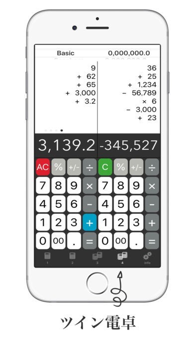 単体の計算機画面が2つ、ツインの計算機画面が2つの合計6個の計算機を同時に使うことができる電卓アプリです。1つの計算を残したまま別の画面で新しい計算をすることが可能なので何度も計算し直す手間が省けます。
