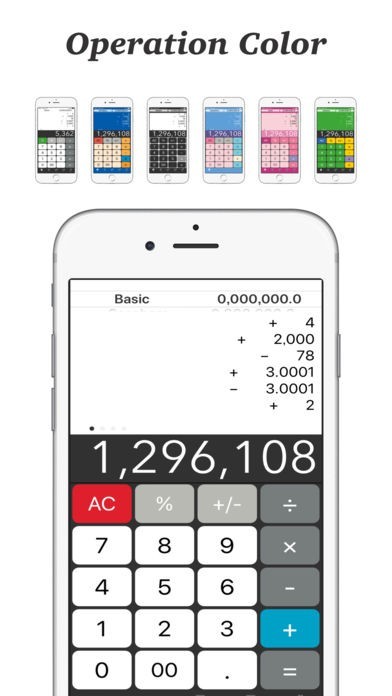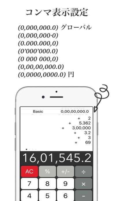 計算しているあいだ、電卓の上部に計算履歴が表示されるので間違っていないか確認しながら計算をすることができます。また、コンマの表示設定を必要に応じて変更することができます。