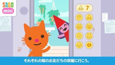 7階建てのアパートに住んでいる主人公のネコが、それぞれの階に住む住民・動物を訪問して知育ゲームが楽しめるアプリです。エレベーターに乗って、どの階に行くか決めるところから始められます。7つのゲームで飽きない!