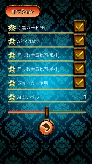 本物さながらに様々な強さのコンピュータと対戦でき、同じ数字のカードを重ねたり、ジョーカーを使用可能にしたりなどのオプションも設定できます。