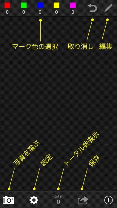 カウントしたいモノをタップするとそこにマークが追加され、カウント数が表示されます。