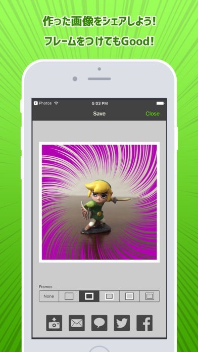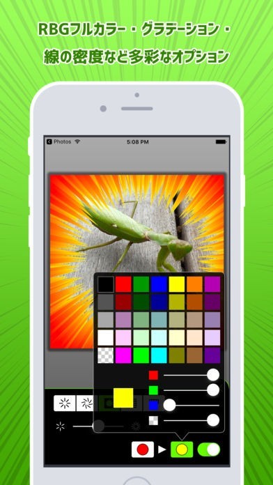 写真を選び、効果線の種類・色・線の密度などのオプションを選ぶだけです。
