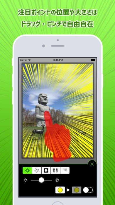 App Storeより引用Motiogram (モーショグラム) は集中線やスピード線などのマンガでよく使われる表現手法を写真に加えるアプリです。