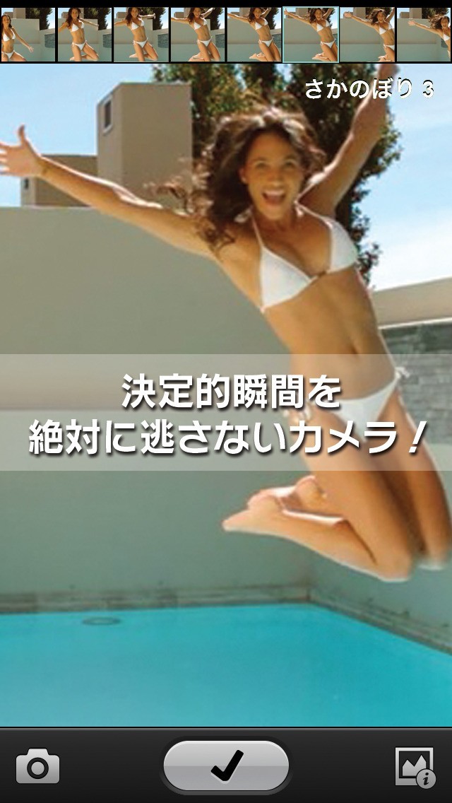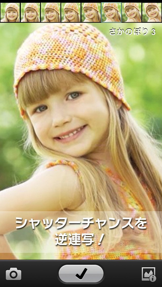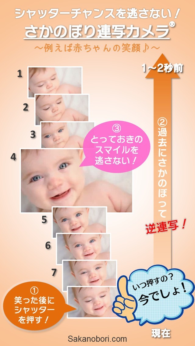『さかのぼり連写カメラ』は、その名の通り、時間をさかのぼって連写する超便利なカメラです!「あ、シャッターチャンス逃しちゃった!」と思ったあとにシャッターボタンを押すだけ。目の前で起こった事をさかのぼって連写撮影できるので シャッターチャンスを絶対に逃しません!