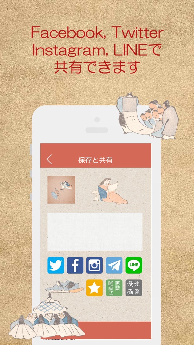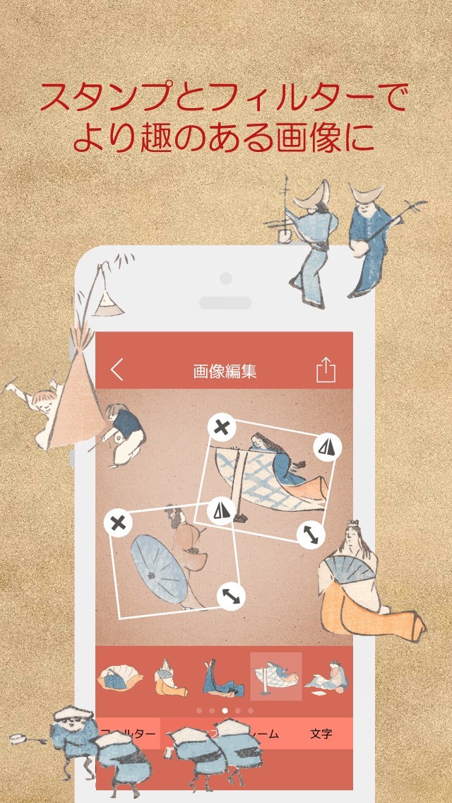 略画式メーカーは写真加工アプリです。浮世絵でおなじみの、鍬形蕙斎がスケッチした着物を着た武士や町民の姿が、自由に使えるスタンプとしてアプリには登録されています。アプリの使用方法はとてもシンプルで、背景とする写真を、ファイルやアルバムから選んだら準備は完了となります。豊富なスタンプやフィルター、フレームを駆使して、自分だけのオリジナル面白画像を製作していきましょう。画像の加工に関しては、イラスト合成だけではなく、文字を貼り付けることもできます。
