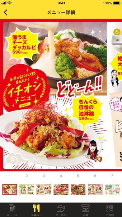 アプリにはメニューの詳細が掲載されており、事前に何を食べようかチェックしておくことが出来ます。クーポンにはデザートが1品サービスされるものや飲み放題1時間延長など様々な種類が用意されており、状況に合わせて選択して利用できます。