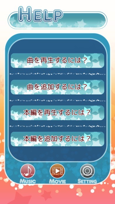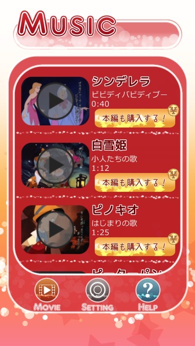 「うたポヨ」では、ディズニーの映画を見れるようにしてくれるといった特徴があります。 無料でも見ることが出来ますし、アプリ内で課金することによって、ロックが解除されて見れるものが増えていくといった仕組みとなっています。 しかし、「Music」では、無料で曲を視聴することが出来、それを見てから、「本編を購入する」をタップすればすぐに映画を視聴することが出来ます。 また、解らないことがあったならば、「HELP」によって、「曲を追加するには?」などといった疑問点を解決することができます。