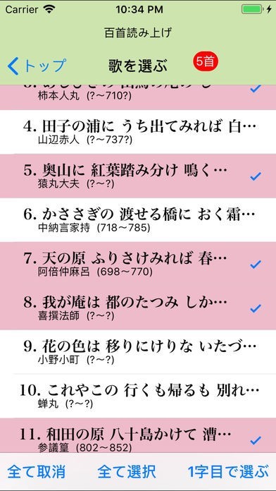 「百首読み上げ」は、読み手がいなくても百人一首を楽しめるよう、読み手の代わりを務めてくれるアプリです。 百人一首の歌詠みはランダム読み上げの他、100首の中から使いたい歌だけをセレクトすることや、取札のないハズレ札である「空札」が設定できるなど細かに設定を行うことができるため、本格的な試合の練習から遊びまで対応できる、百人一首ファンの方におすすめのアプリです。