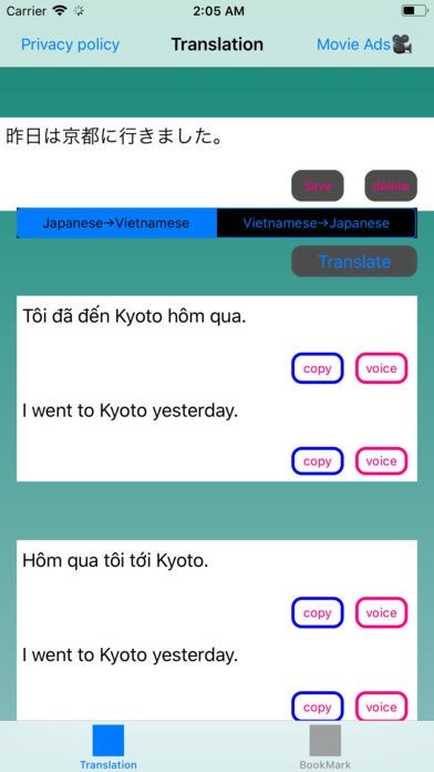 ベトナム語翻訳 / 日本語からベトナム語と英語を同時翻訳のスクリーンショット