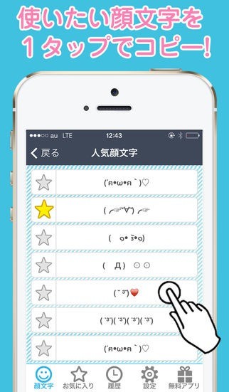 好みの顔文字はお気に入り機能に即登録!背景画像変更機能で自分だけの画面が楽しめる!
