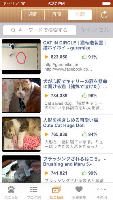 共有機能があり、お気に入りのねこの動画は、ラインなどで友達に送れる