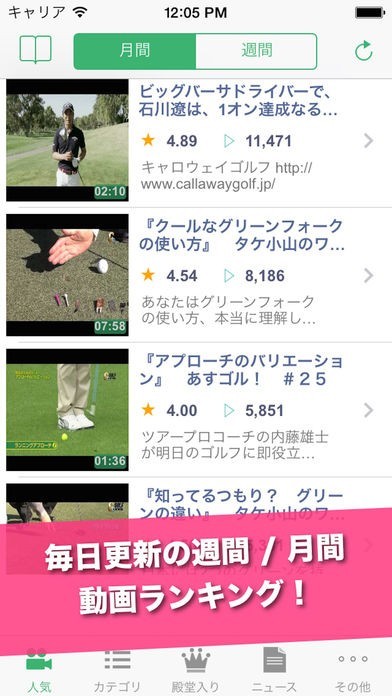 複数のレッスン動画が用意されていて、ゴルフのお役立ち情報を閲覧出来るのが良い