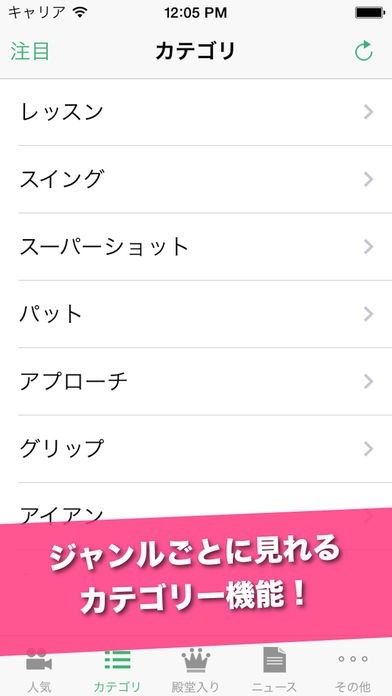 カテゴリー別にゴルフのレッスン動画が拝見出来る