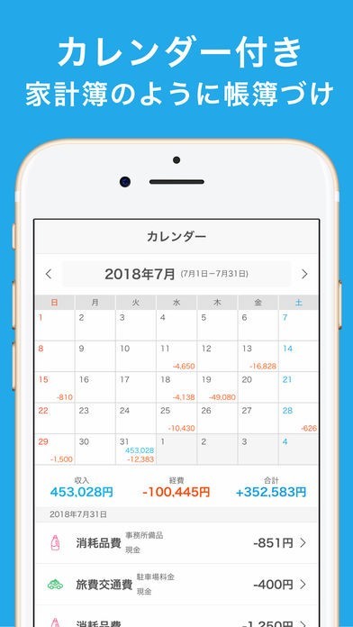 毎日の売上や経費を入力していけば、所得を自動で計算します。勘定科目の選択もでき、それぞれ設定を変更することも可能です。カレンダーにその日の取引を表示できるため、入力しわすれる心配がありません。