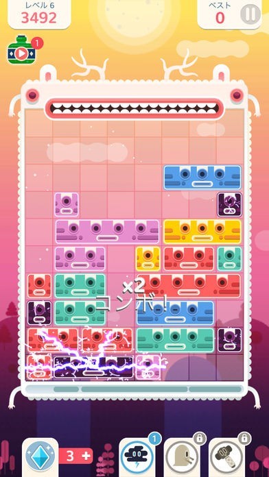 色々な能力を持つアイテムを用意しており、使うことでパズルを有利に進められます。ブロックの位置を見極めながら最適のタイミングで使えば、スコアが大幅にアップ。よく考えながらプレイして、脳を鍛えましょう。