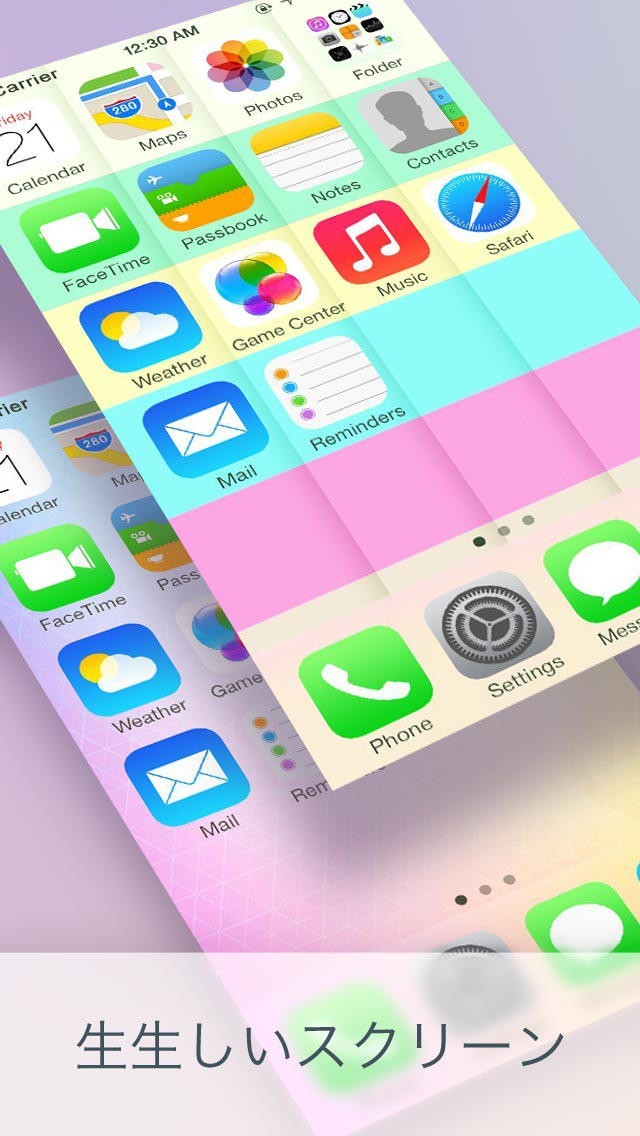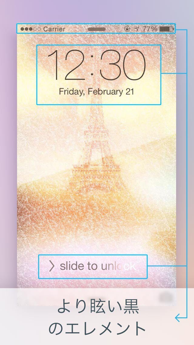 スマートiOS 7の特性に従い、壁紙のの色収差を用い、タイム、バッテリーアイコン、スワイプバー、フォント、カメラアイコン等の色が全てその反対の色に設定されます。
