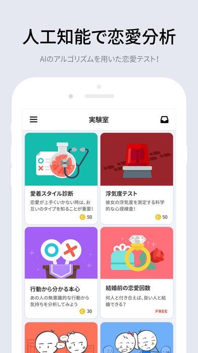 恋愛に関する情報が豊富に用意されていて、人気順で記事を確認出来るようになっています。また人工知能に基づいた心理テストが多彩に収録されているため、自分の深層心理や恋愛傾向も細かく分析していけます。