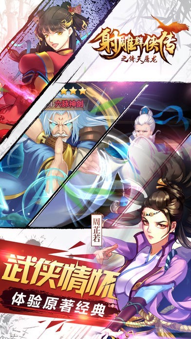 天下武林,争斗不休。东邪西毒,南帝北丐,听你号令。武林前辈觉远、黄杉女;开派宗师王重阳、张三丰纷纷现身。更有郭靖黄蓉,演绎“铁胆忠魂”缘分合击。杨过小龙女,释放“神雕侠侣”终极必杀。齐聚射雕三部曲群侠豪杰,上演热血江湖大乱斗。