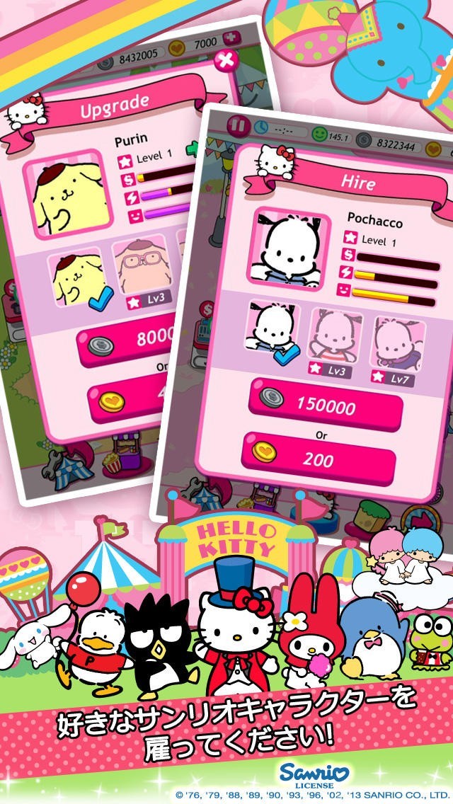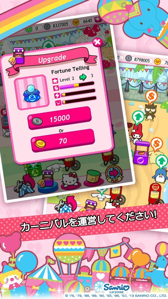 お客様のお楽しみを盛り上げてくれるのは、カーニバルスタッフとして働いている、かわいくて優しいサンリオキャラクターたちです。Hello Kittyカーニバルにいらっしゃるお客様は、11の愛らしいキャラクターたちに出会います。Hello Kitty, Pekkle, Keroppi, My Melody, Pochacco, PomPomPurin, Little Twin Stars (Kiki and Lala), Badtz-Maru, Cinnamoroll そして Tuxedosam、キャラクターたちはみんなカーニバルに大忙しです。 どのキャラクターもアップグレードできるので、どれをどうアップグレードするかはあなた次第です。