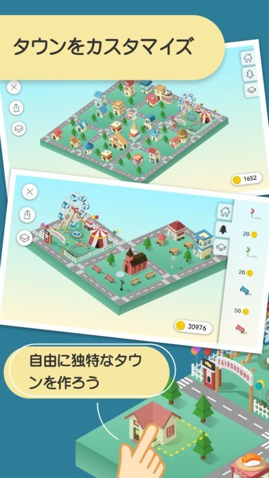 タウンのカスタマイズ機能を搭載しており、お好みで地形や建物をカスタマイズできるようになっています。好みの家だけを並べてみたり、カラフルにデコレーションしてみたりと、多彩な楽しみ方を見つけられます。